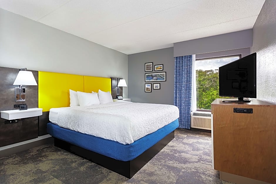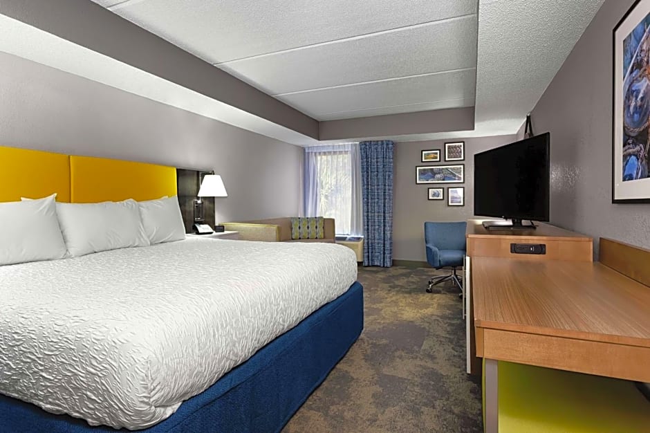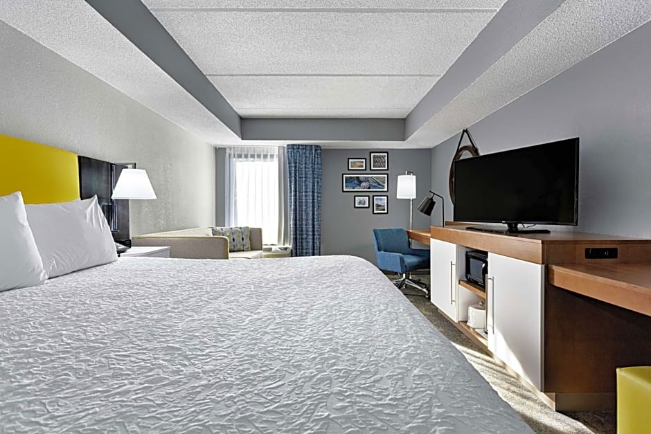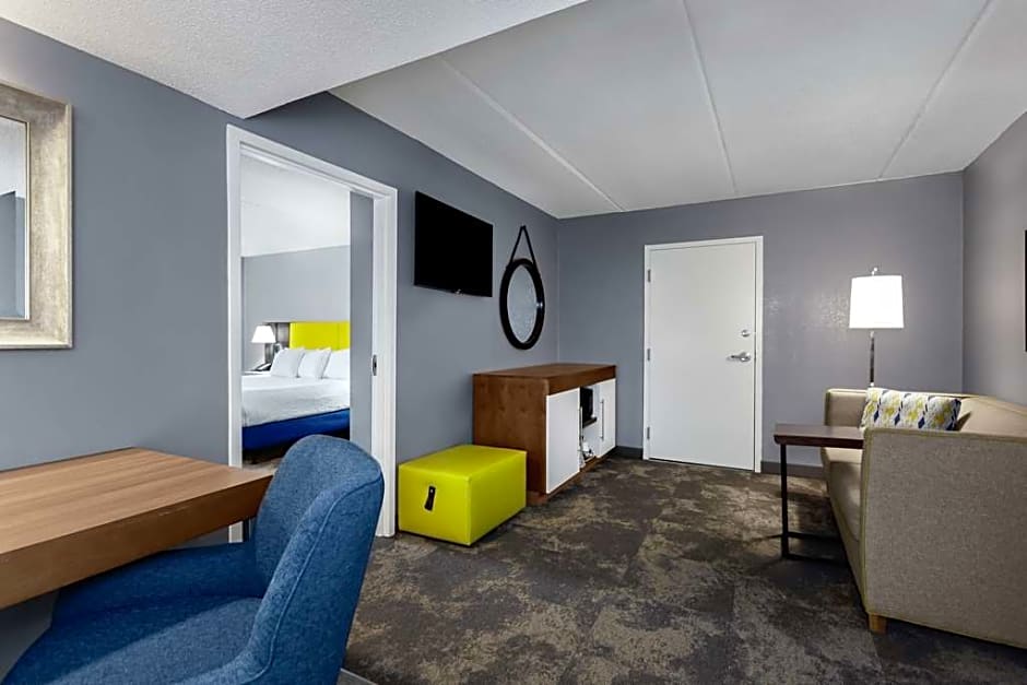 Sitting area, sofa bed, 2 LCD TVs, work desk, wet bar, coffeemaker, free WiFi access Find all the space you need in this spacious suite featuring a king-sized clean and fresh Hampton bed® plus a comfortable seating area with a sofa bed and two lounge chairs and a wet bar with a refrigerator and microwave. This suite also features two 25-inch HDTVs, a large work desk and a coffeemaker. Free WiFi access will help you to stay connected when on the road. The bathroom contains plush towels and a shower featuring a curved shower rod for added space and light.