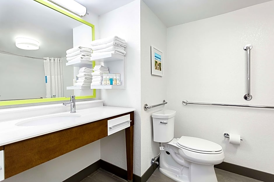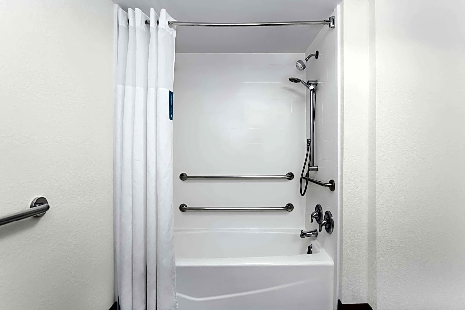 This mobility and hearing accessible, non-smoking room features one king-sized bed, and an accessible roll-in shower. The room also has a visual alarm and notification devices for the doorbell or door knock and incoming phone calls. The room features comfortable soft seating, microwave, refrigerator, a HDTV, and easy to operate alarm clock/radio. The WiFi access will help you stay connected while on the road. If you prefer not to work at the desk, you can use the convenient lapdesk instead. You'll also enjoy the convenience of having a coffeemaker with tea service and iron/ironing board in your room. Any corresponding photo may not reflect the specific accessible room type or room feature.